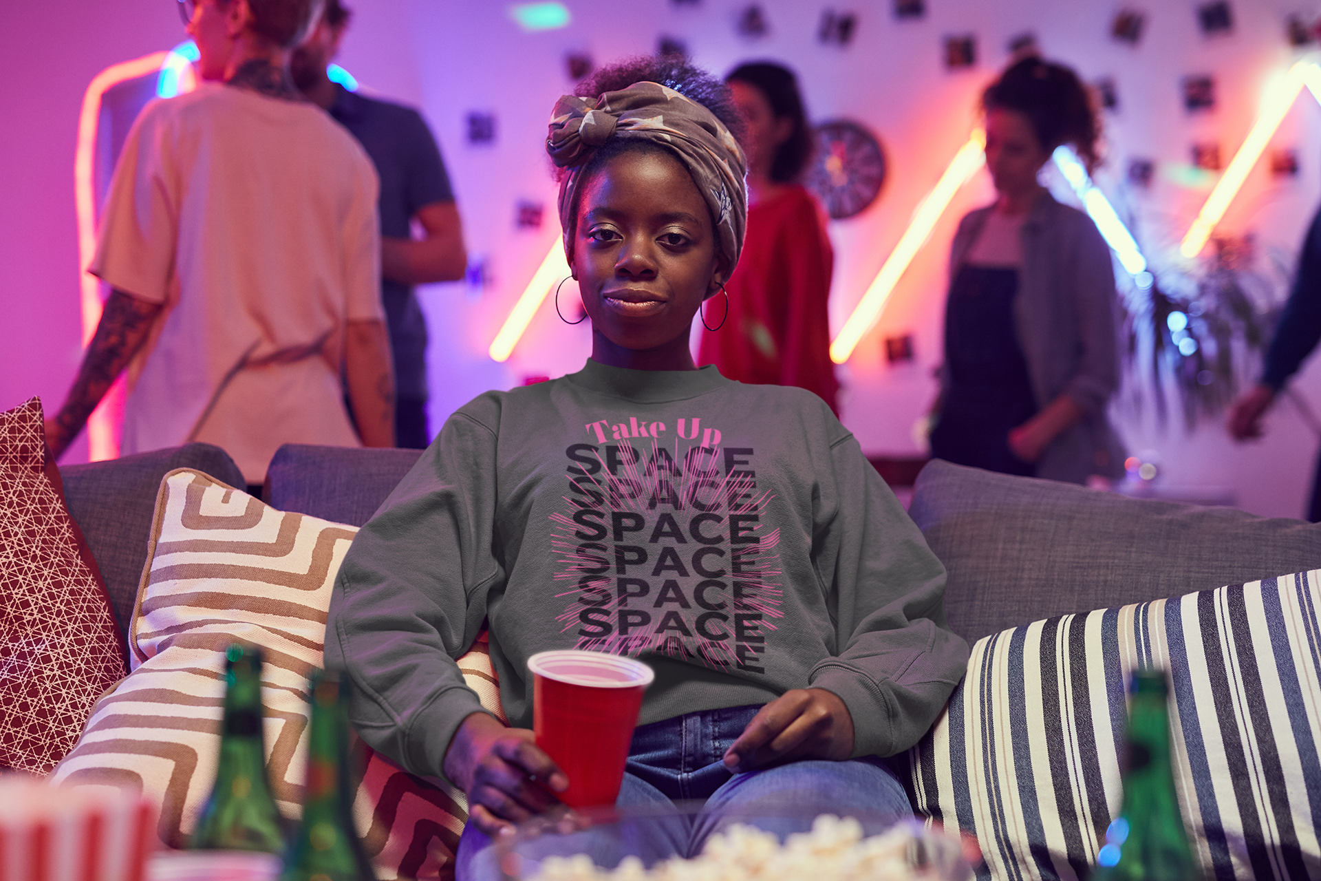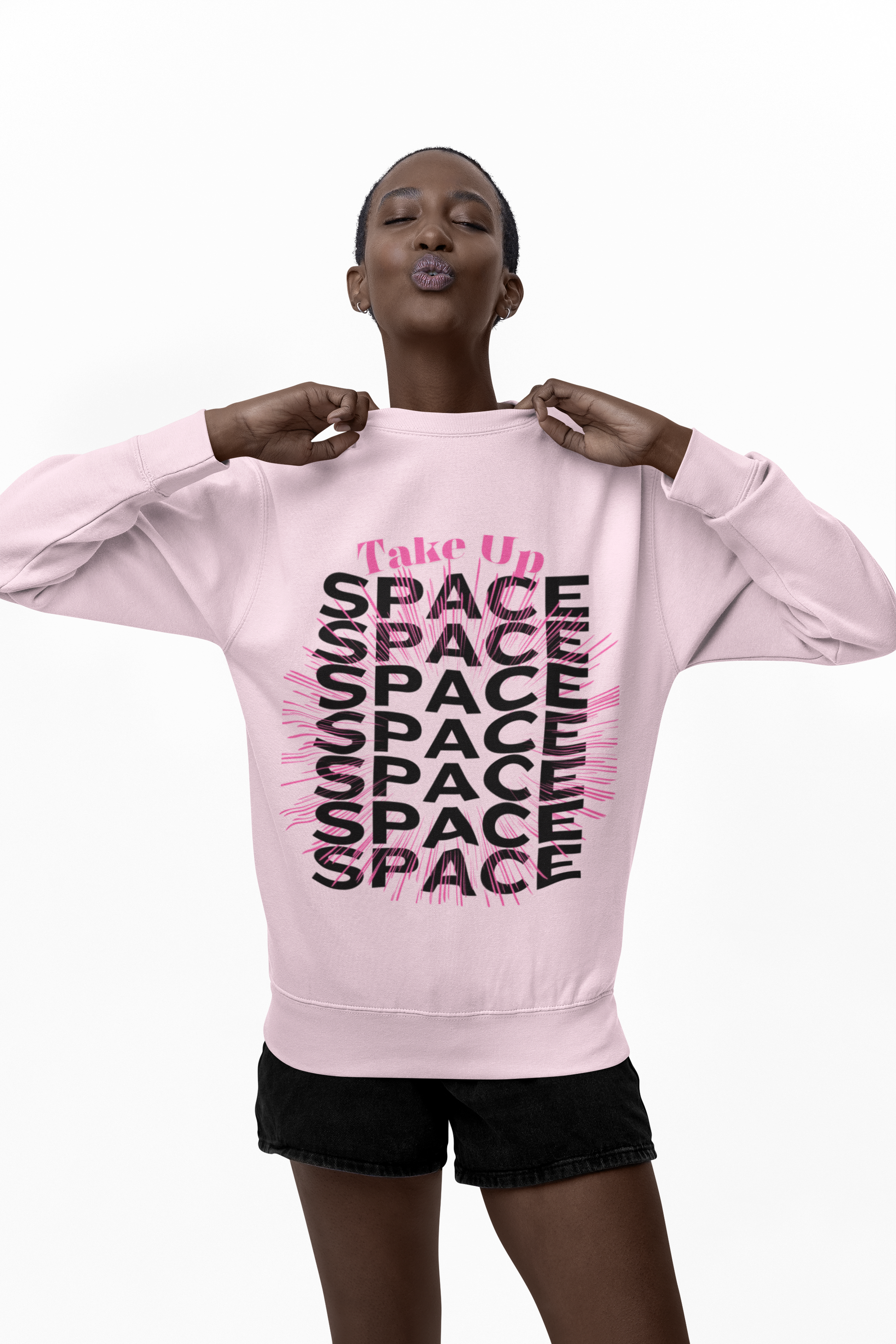 Printed graphic: “Take Up Space” layered design in pink and black